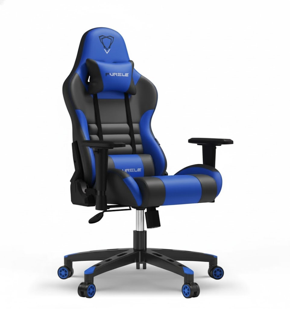 كرسي ألعاب جلد فاخر أزرق وأسود بمسند رأس