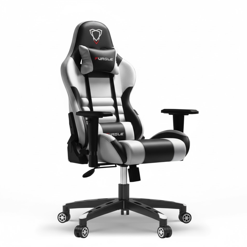 كرسي ألعاب جلد فاخر أبيض وأسود تصميم رياضي